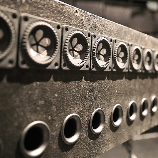 In Spring 2016, EMPAC completed construction on a 496-channel wave-field audio system, one of the most extensive in the world. Consisting of very small speaker heads oriented very close together, the system produces a 3D audio environment by localizing the source of individual sounds with an extreme level of precision.