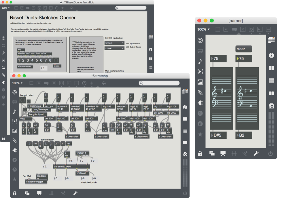 The Max/MSP patches can be seen below: the main “opener” patch that allows me to easily launch each of the sketches, the subpatch for Stretch and a small subpatch that I used to verify the computer’s MIDI output in real-time.
