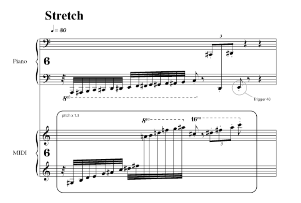 The first of the studies to be transcribed is Etude, No. 5, Stretch. I have completed an archival audio recording, recordings of the dual MIDI data streams (piano and cpu), scored the piano performance score using Finale, and scored the computer part on a second Finale staff.
